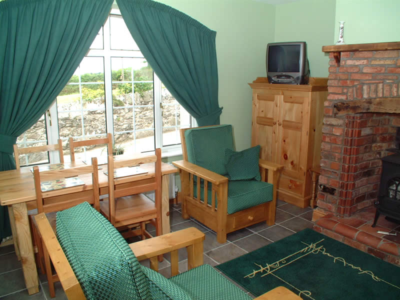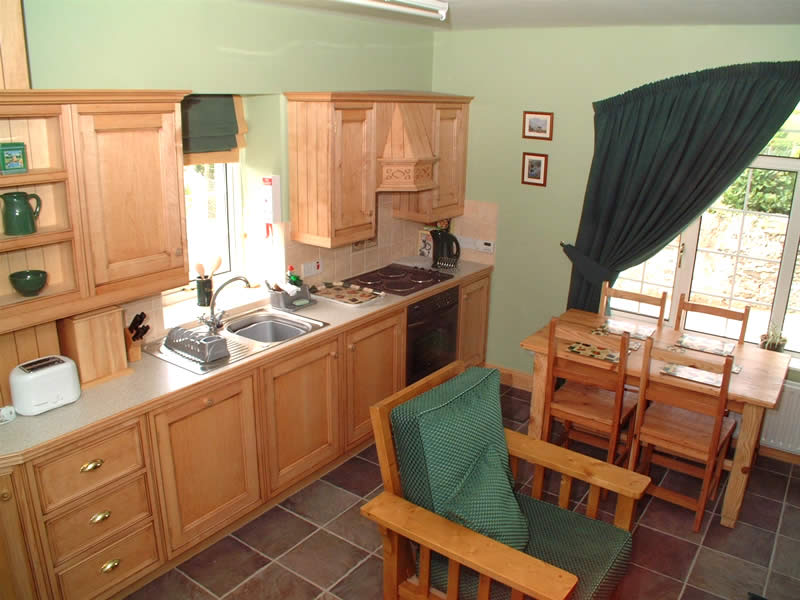 Green and luxuriant describe both the furnishings downstairs and the surrounding countryside which the cottage overlooks.
